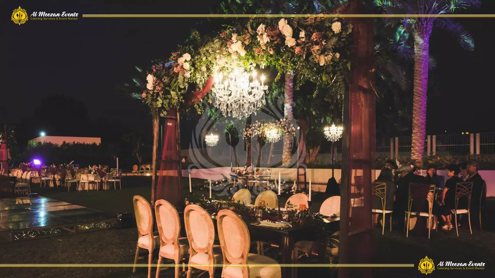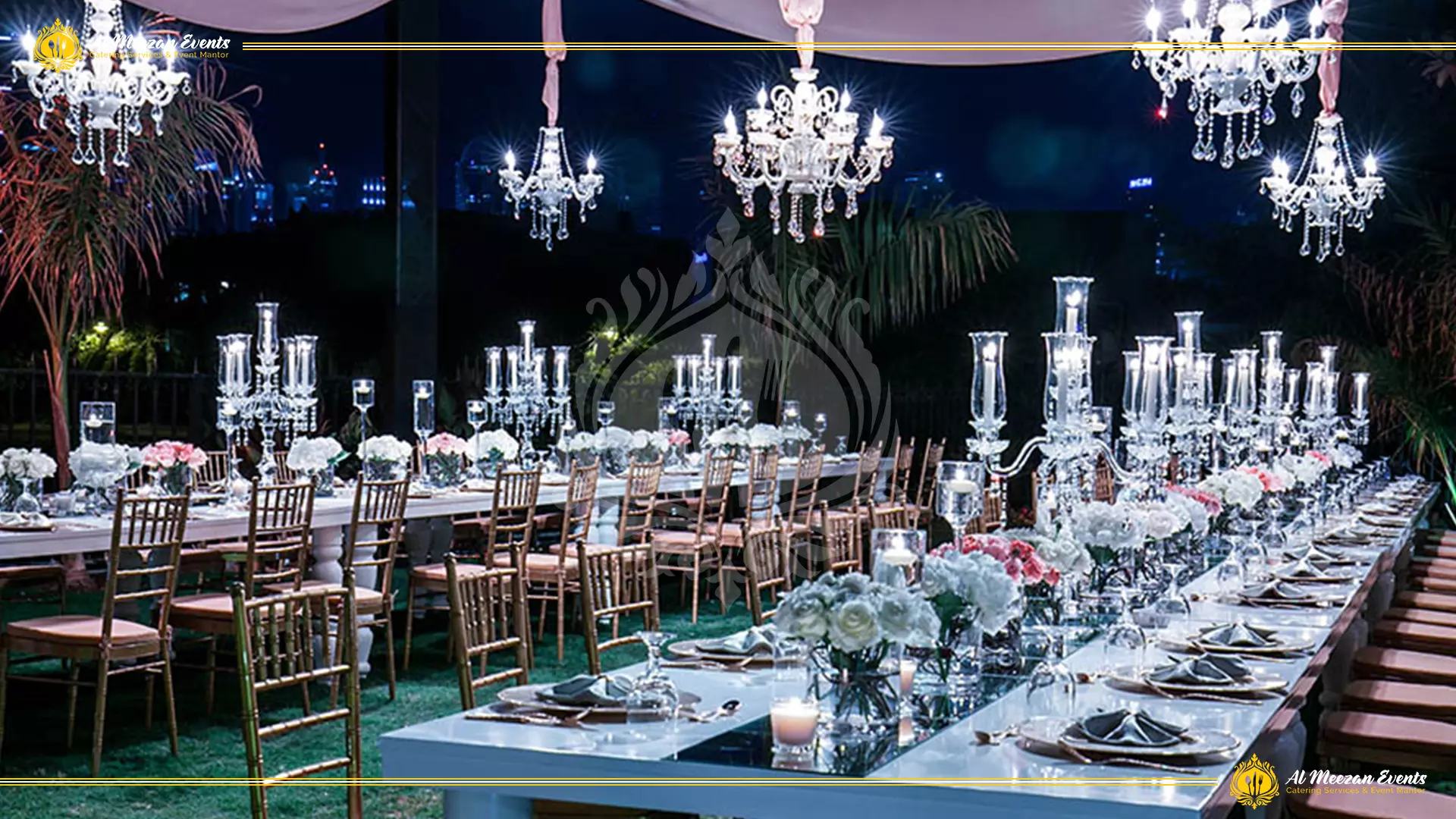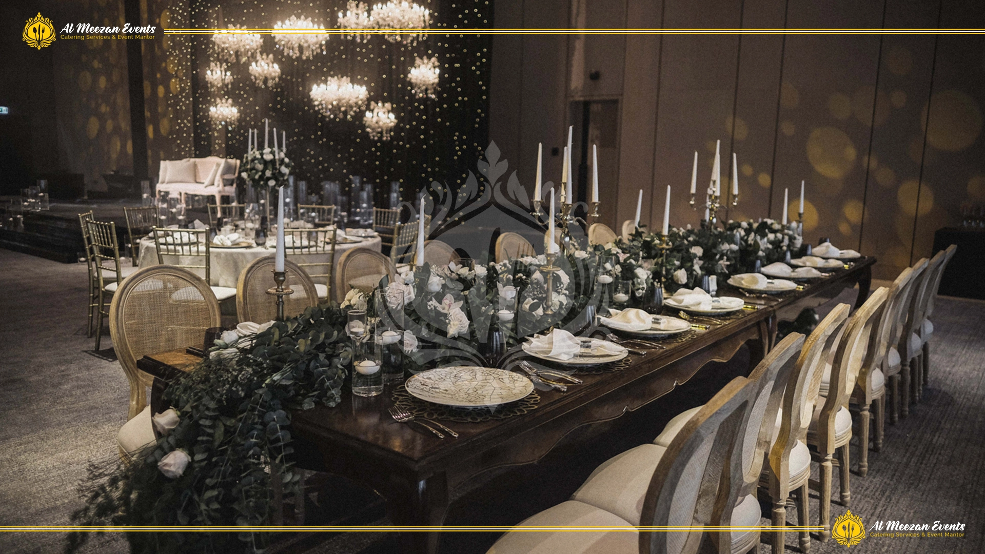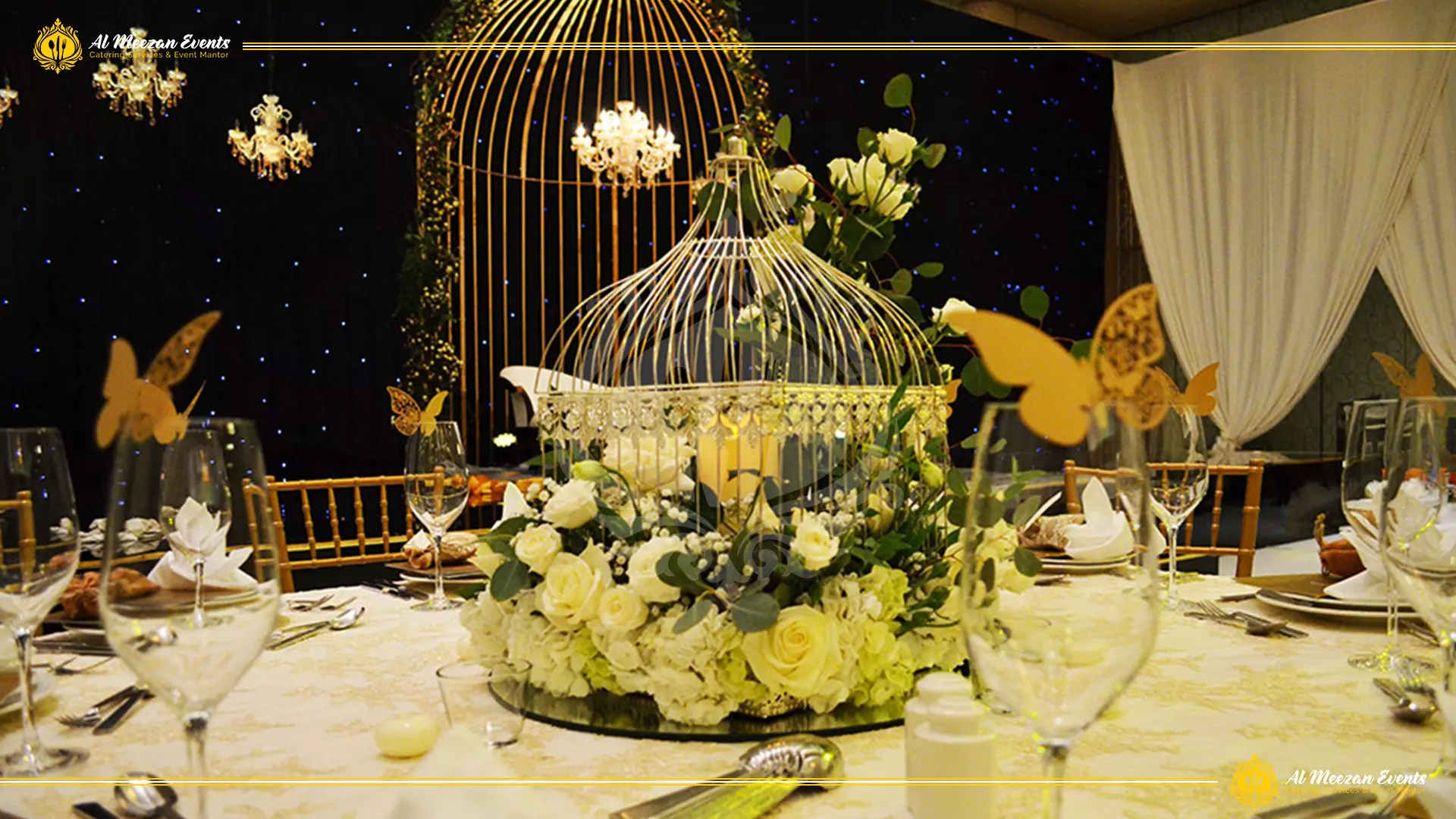A luxurious dinner setup was designed and executed by Al Meezan Events under a magical fairy lights tent.